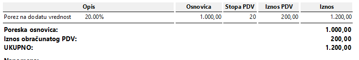 Ovakva faktura zadužuje artikle za 1000 – 10 = 990 din. Takođe se dobavljaču odobrava 990 din, bez obzira što je iskazan PDV (obrnut obračun PDV). U KUF se knjiži bruto osnovica (1000 din), a pri tom se u internim obračunima kreira stavka sa PDV od 200 din.