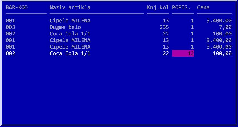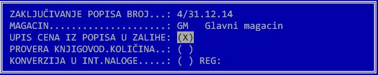 Opcija UPIS CENA IZ POPISA U ZALIHE određuje da li cene iz popisa treba upisati u zalihe. Ova opcija je obavezno uključena. Opcija PROVERA KNJIG.KOLIČINA služi da se provere knjigovodstvene količine na popisu. Ako se ova opcija uključi, program generiše kartice za svaki artikal i proverava da li se stanje pre popisa slaže sa knjigovodstvenim stanjem u popisu. Ukoliko se ovo ne slaže, ispisuje se upozorenje. KONVERZIJA U INT.NALOGE - Ova opcija se koristi kada želite da popis konvertujete u interni ulaz. U interni ulaz ulaze samo iskazane razlike po popisu, a sam popis se briše iz evidencije. Na kraju se postavlja još jedno kontrolno pitanje i time je popis zaključen. Zaključen popis je upisan u trenutno stanje i ne može se više menjati.