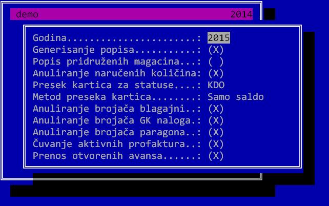 Prenos otvorenih avansa - Ova opcija prenosi u novu godinu sve avansne fakture koje nisu zatvorene. Na taj način ćete imate na jednom mestu sve otvorene avanse. Sistemsku opciju “Provera avansa u prethodnoj godini” treba isključiti u ovom slučaju, ukoliko je uključena.