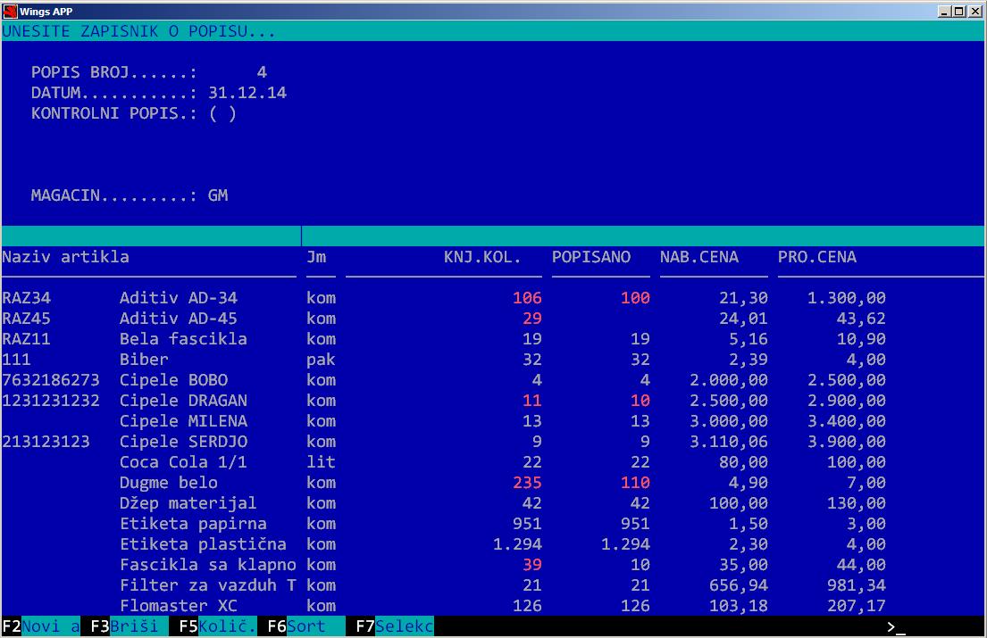 1. Popisi i početna stanja. Pre otvaranja nove godine treba srediti eventualne probleme u dokumentaciji i zalihama. Po zakonu ste obavezni da uradite popis zaliha, dugovanja i potraživanja i da to uskladite sa stvarnim stanjem. Ako je sve dobro urađeno, u “Pregledu artikala” su ispravne količine i cene, a sve kartice partnera su ispravne i dobro zatvorene. Ispravnost zaliha možete da proverite u “Pregledu artikala” komandom Alt-F8 (uključite opciju Cene: prodajne ili nabavne, u zavisnosti od vašeg metoda vođenja zaliha), a za detalje vidite help temu „Sravnjivanja zaliha“ (F1, pa opet F1).