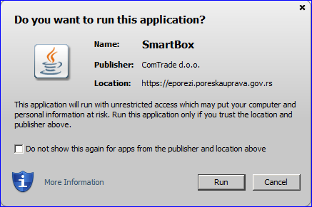 Napomena : ukoliko imate stariju verziju jave može se desiti da browser onemogući aktiviranje programa poreske uprave i tako spreči pristup sajtu. Uvek držite vašu verziju jave ažurnu!