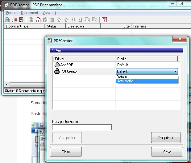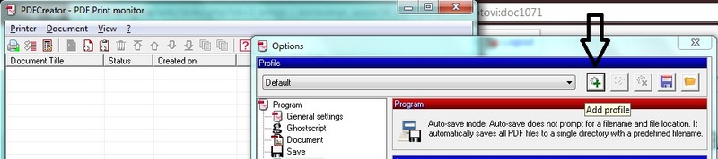 Ako korisnici već imaju instaliran PDFCreator i žele da nastave da prave PDF fajlove preko njega, treba uraditi sledeću stvar. U opcijama treba dodati novi profil, klik na prvu ikonicu sleva u gornjem desnom uglu. Može da ostane New profile 1. Save.