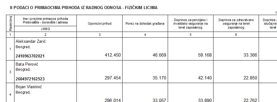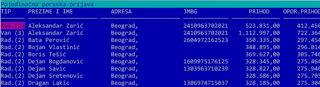 Postupak popunjavanja PPP obrasca je isti kao i prethodnih godina. Prvo je neophodno staviti novu verziju App-a jer su početkom godine rađene neke izmene u ovom delu programa. Izabere se opcija Poslovanje/Radnici i zarade/Pojed.por.prijava PPP i zada se period 01.01.gg - 31.12.gg. gde je GG prethodna godina. Program inicijalno daje zadnje sačuvane podatke (verovatno ćete dobiti podatke od prethodne godine). Komandom F9 se ponovo generišu podaci i dobija se ovakva tabela:
