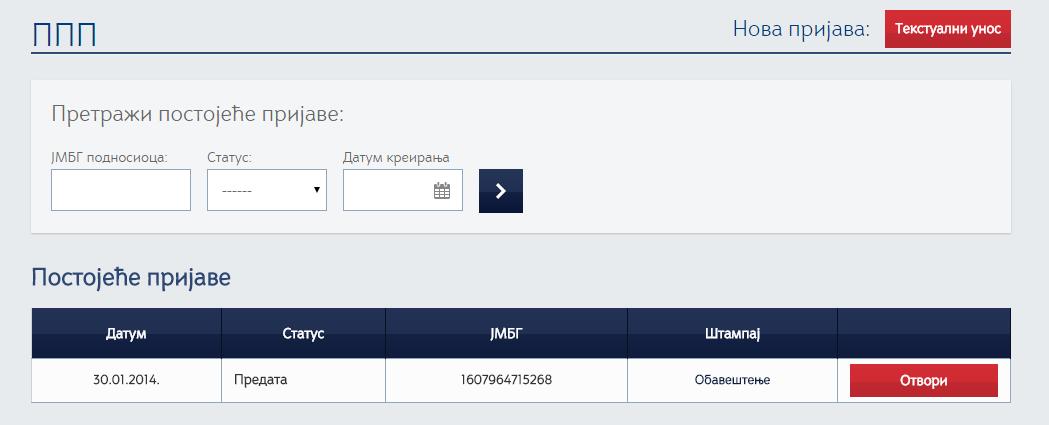 Tako se dobija pregled ranije poslatih prijava, a za slanje nove prijave kliknite na link Nova prijava: Tekstualni unos u gornjem desnom uglu.