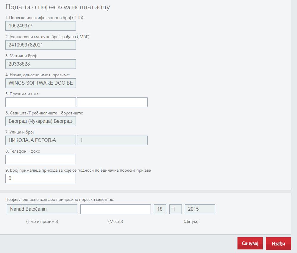 Sada se dobija forma sa osnovnim podacima o firmi. Većina podataka je već uneta, potrebno je samo dopuniti podatke: nedostaje broj radnika, broj telefona i mesto.