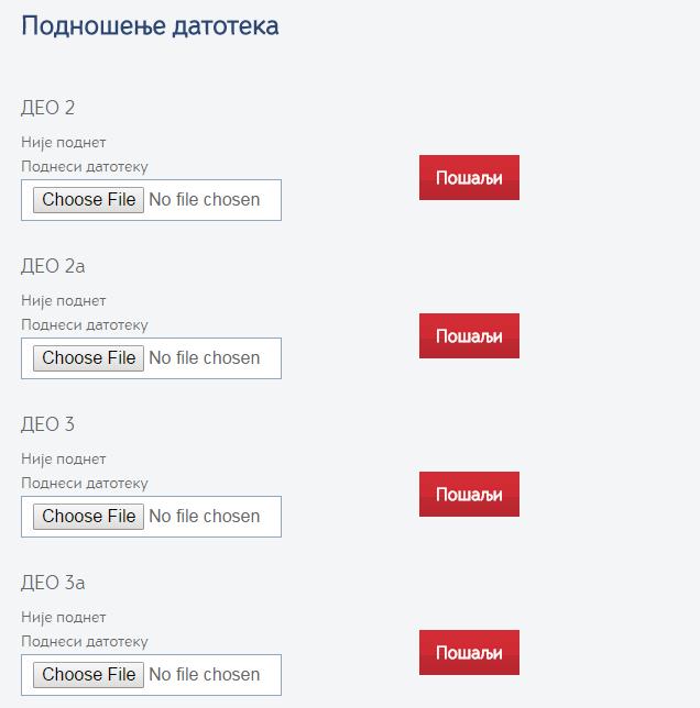 Izaberite deo koji želite da pošaljete klikom na dugme Choose file, izaberite odgovarajuću datoteku, a zatim kliknite na Pošalji. Ukoliko ima grešaka, biće ispisane. U tom slučaju proverite generisanu prijavu i ponovite postupak. Šaljete samo delove koje imate. Na primer, ako imate samo zaposlene radnike, imaćete samo deo2.txt. Kada pošaljete sve delove, kliknite na dugme Pošalji.