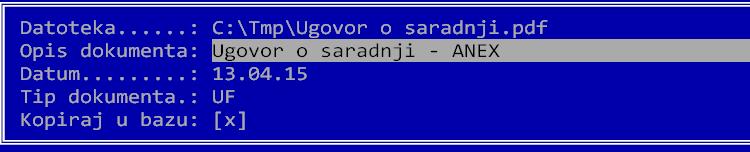 Prvo se bira datoteka, zatim se unose prateći podaci: opis, datum, bira se tip dokumenta i na kraju se može uključiti opcija “Kopiraj u bazu”. Ukoliko se ova opcija uključi, originalna datoteka se kopira u internu bazu programa i kasnije se može dobiti bez obzira na originalnu datoteku. Ukoliko će originalna datoteka biti stalno dostupna, ne morate je kopirati u internu bazu.