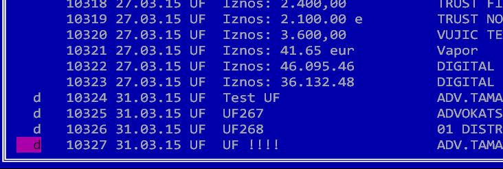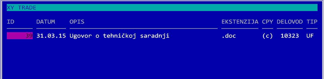 Stavke koje su već vezane sa nekim datotekama ne mogu se ponovo vezivati i one su označene slovom “d”. Stavku vezujete tako što je izaberete tasterom Enter. Kolona Delovodnik dobija odgovarajući broj u delovodniku. Ponovnik aktiviranjem komande F8 možete prekinuti ovu vezu. Ukoliko je neka datoteka već upisana u delovodnik, komandom Sh-F8 je možete povući i u tekuću e-arhivu. Na primer, na taj način vezujemo ugovor koji je ranije upisan u delovodnik za izabranog kupca.