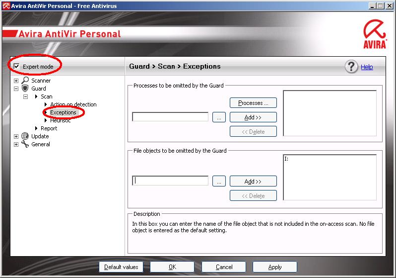 U sledećem prozoru obavezno čekirati Expert mode i otvoriti opcije na: Guard→Scan→Exceptions