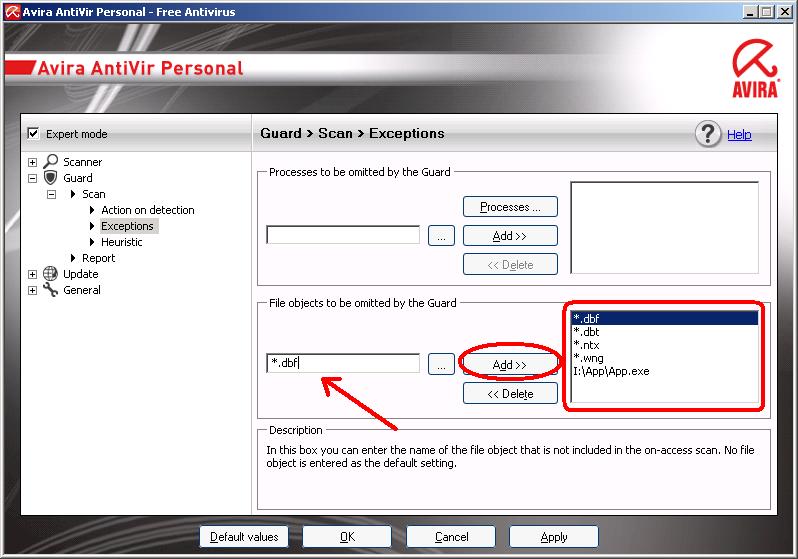 U sekciji: File object to be omitted by the Guard upisati ekstenzije koje ne treba skenirati i kliknuti naAdd.
