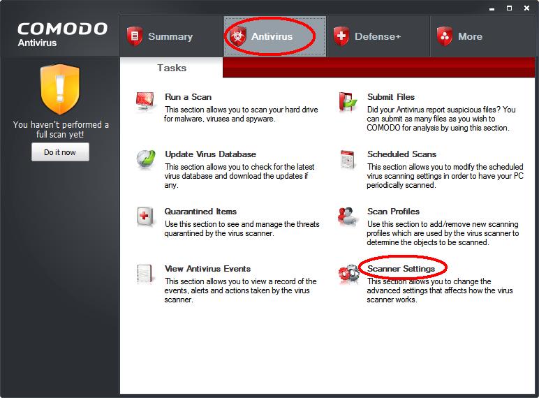 Nakon startovanja programa izabrati tab Antivirus i sekciju Scanner settings