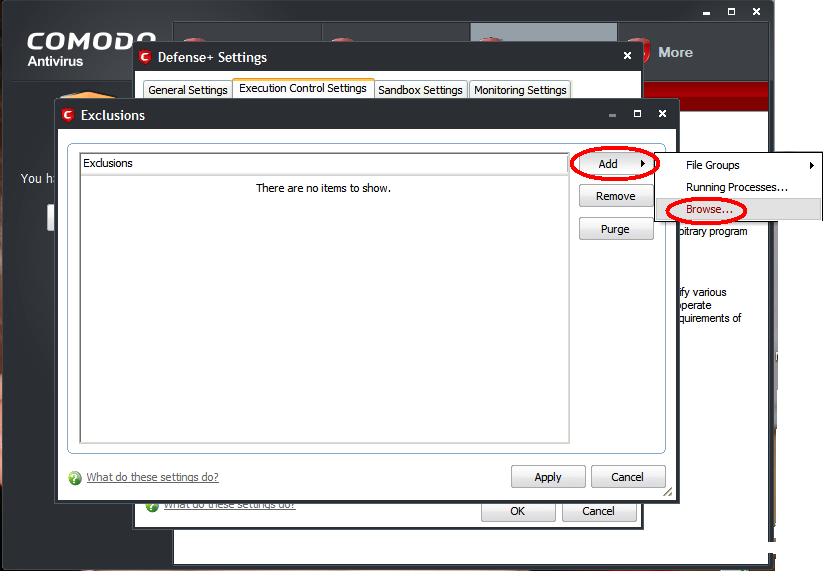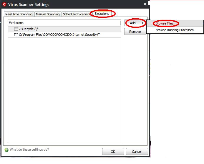Izabrati tab Exclusions, kliknuti na Add, pa na Browse Files…