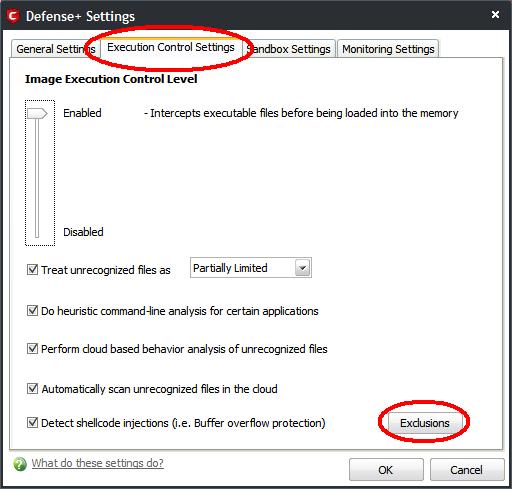 Izabrati tab Execution control settings i klinuti na dugme Exclusions.