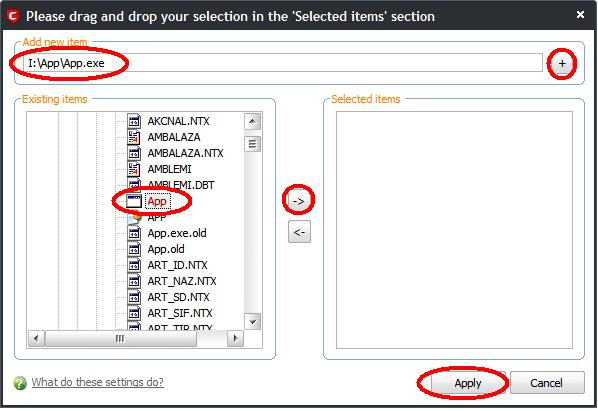 Upisati putanju do App.exe u polju Add new item pa kliknuti na + ,ili je izabrati iz sekcije Existing items, pa kliknuti na →