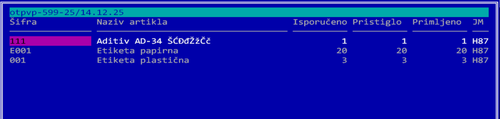 Ova opcija služi za pregled količina pristiglih po otpremnici i kreiranje prijemnice. U koloni Isporučeno je količina navedena u otpremnici, a mogu se menjati kolone Pristiglo i Primljeno. Na primer, može se desiti da je na otpremnici navedeno nečega 100 kom, ali je pristiglo 5 kom manje. Međutim, ni preostalih 95 komada ne mora biti primljeno (na primer zbog oštećenja i sl). Artikli kod kojih se razlikuju količine su označeni crvenom bojom.