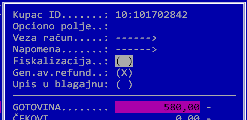 Ova opcija se pojavljuje samo kad je u pitanju konačna faktura sa avansima. Normalno se ona uključuje kad se generiše konačna faktura. Tada se generiše AR za iskorišćene avanse i PP za konačni račun. Međutim, povremeno se desi problem sa PFR i mada se AR generiše, PP se ne generiše. Tada se ponovo startuje opcija F10 za fiskalizaciju i ovoga puta se isključuje opcija „Generisanje avans refundacije“ (jer je već generisana).